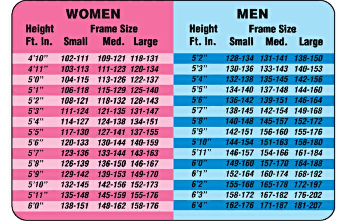 According to your height, (which can be found in the first column) and depending on whether you are a male or a female, see the range of ideal weight.